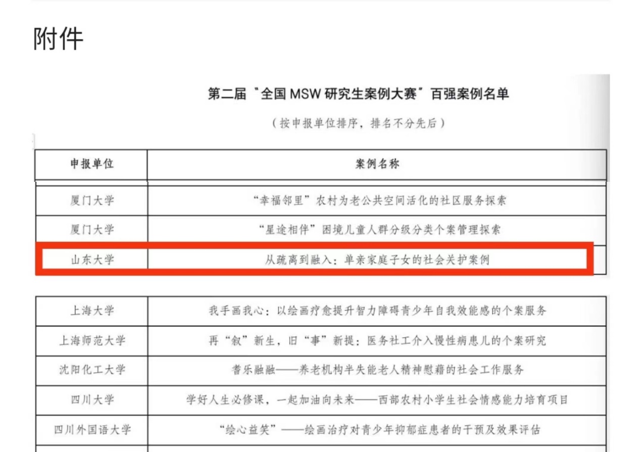 近日,第二届“全国MSW研究生案例大赛”公布百强案例名单。我院社会工作系2020级硕士研究生王振、王锡政、刘玉洁、张伟华、孙硕、李敏等提交的司法社会工作服务案例《从疏离到融入:单亲家庭子女的社会关护案例》名列其中。全国MSW研究生案例大赛由全国社会工作专业学位研究生教育指导委员会主办,旨在持续引导我国MSW研究生关注社会工作领域的实际问题,不断提高其运用相关理论和方法解决实际问题的能力。据悉,本届案例大赛评审工作组将案例按区域分为四组,邀请66名行业专家按照“同一个参赛案例需经其他区域一位高校专家和一位行业专家评审”的要求和《第二届“全国MSW研究生案例大赛”初赛评分细则》进行匿名评选,根据综合评分结果评选出百强案例。